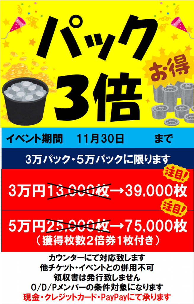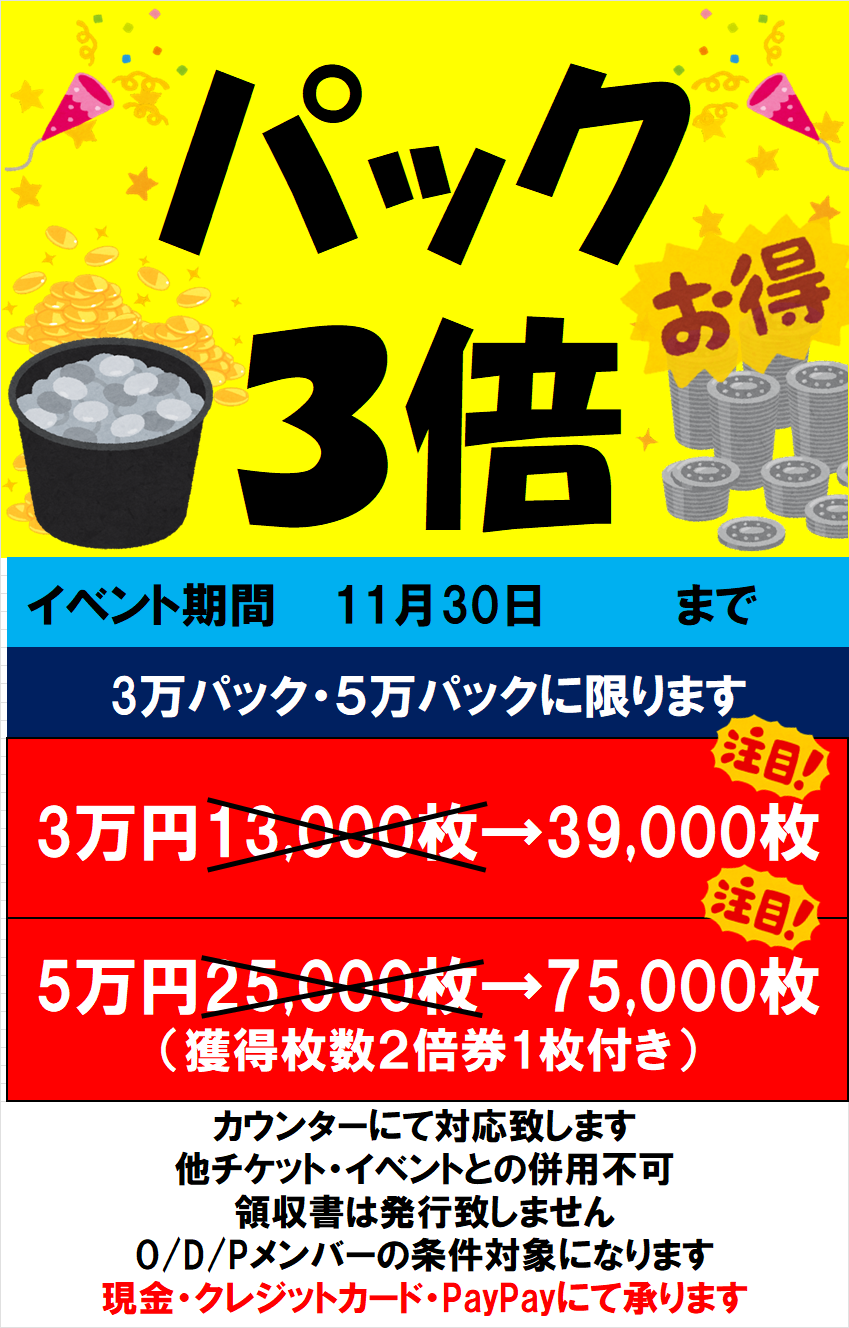 3万・5万円パックのメダル枚数を3倍でお求め出来ます!