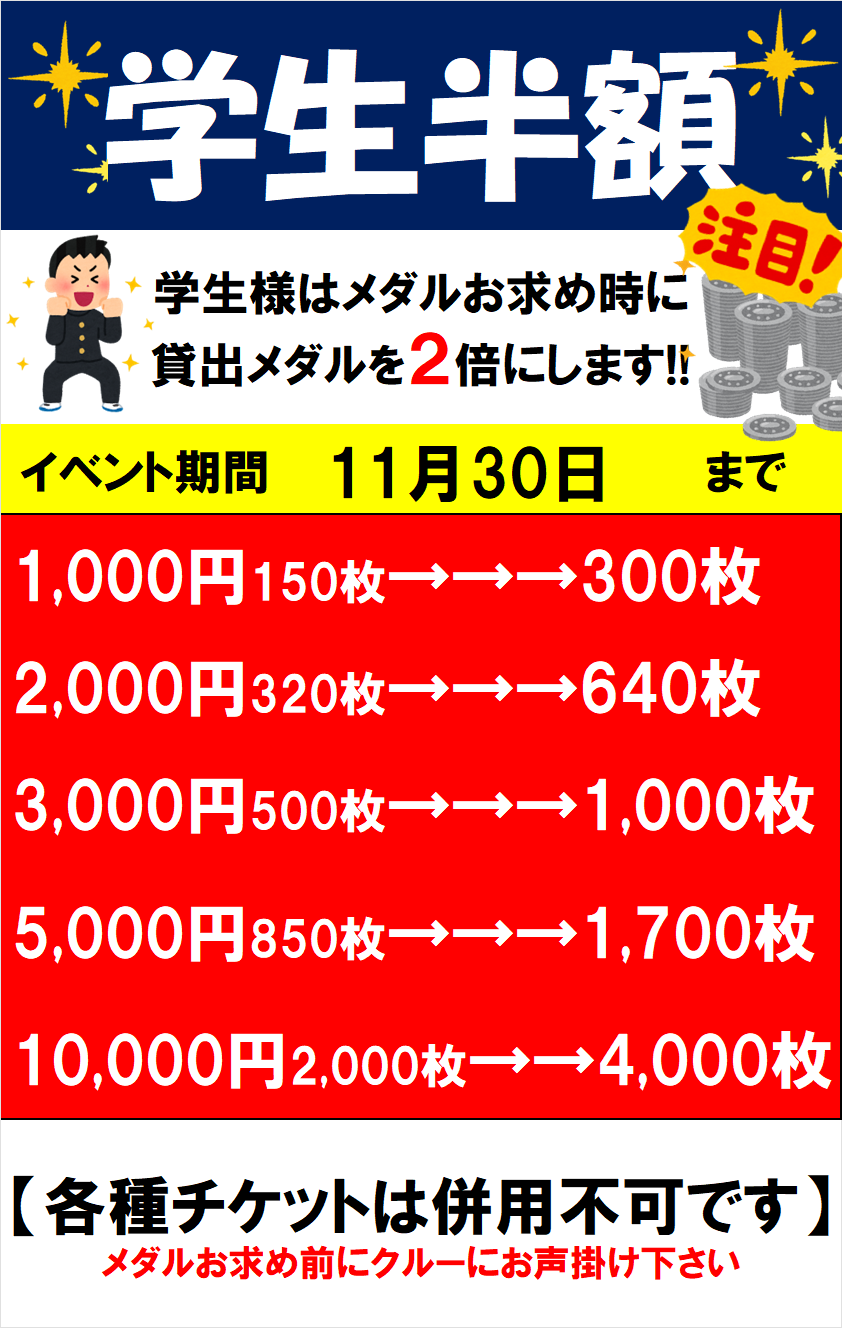 学生様限定!メダルお求め時に貸出メダルを2倍に致します!