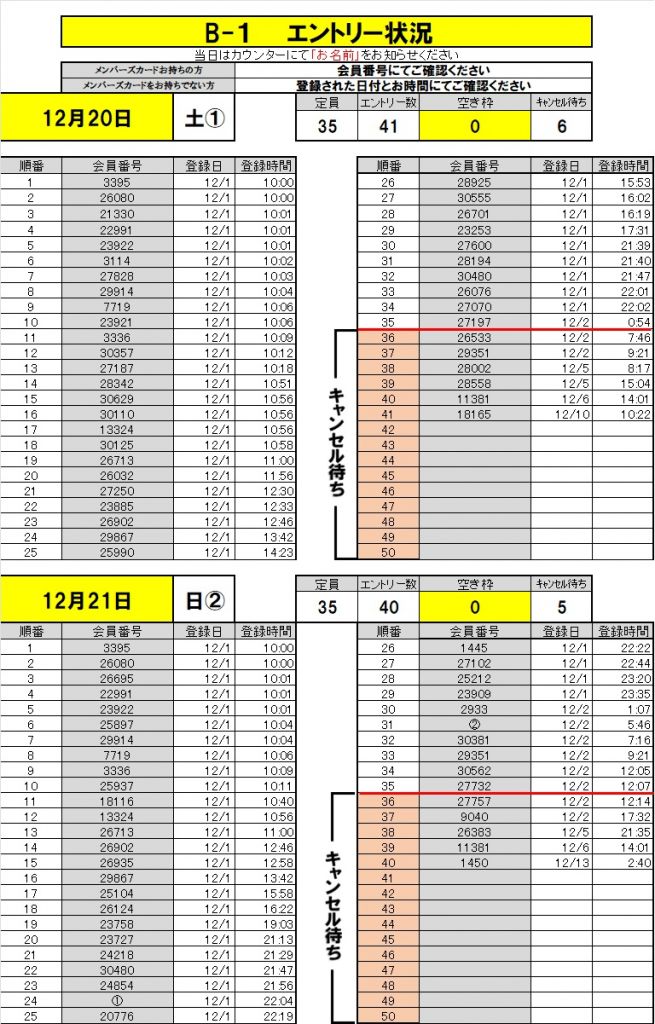 定期的に更新される下記のエントリー状況を確認して頂きご自身の会員番号がない場合は