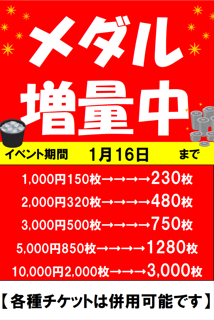 - 貸出機からのメダル増量中♪ 1/16まで - 2025年12月29日